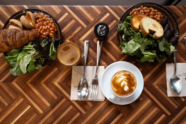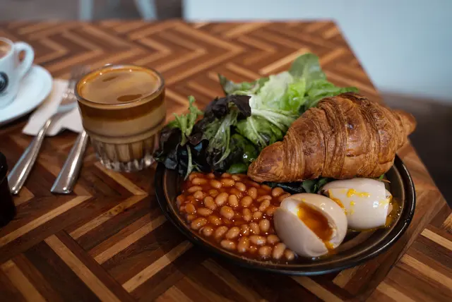 食物方面其實都冇咩選擇,沙律菜好新鮮,茄汁豆好大份,牛角包🥐比想像中好食,牛油味幾重幾香,外脆內軟熟,糖心蛋都ok既,但整體比預期中出入太大,印象中以前的all day真係幾好食,有bagel,好似仲有bacon同腸仔,轉左素之後真係好一般,all day可以揀既材料又唔多,Dirty奶同啡又未溶合到,所以expresso 酸同甘的味道出哂嚟,下面就係oat milk有d甜的味道