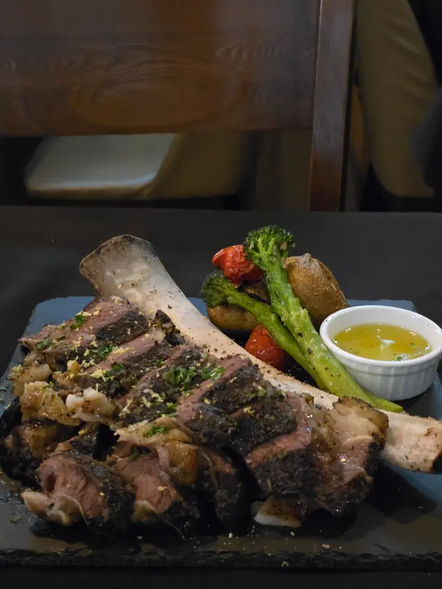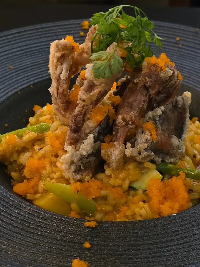 主菜的炸軟殼蟹蟹黃意大利飯,綿滑入味,軟殼蟹超級酥脆。12小時慢煮美國牛肋骨份量相當多,肉質軟嫩,用叉子即可輕鬆分開。