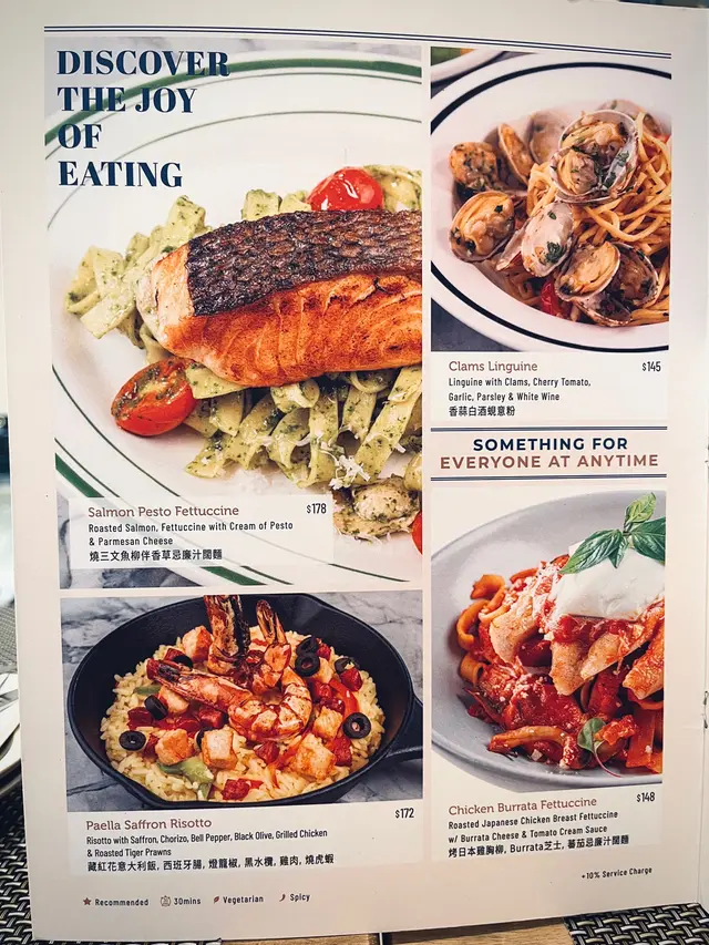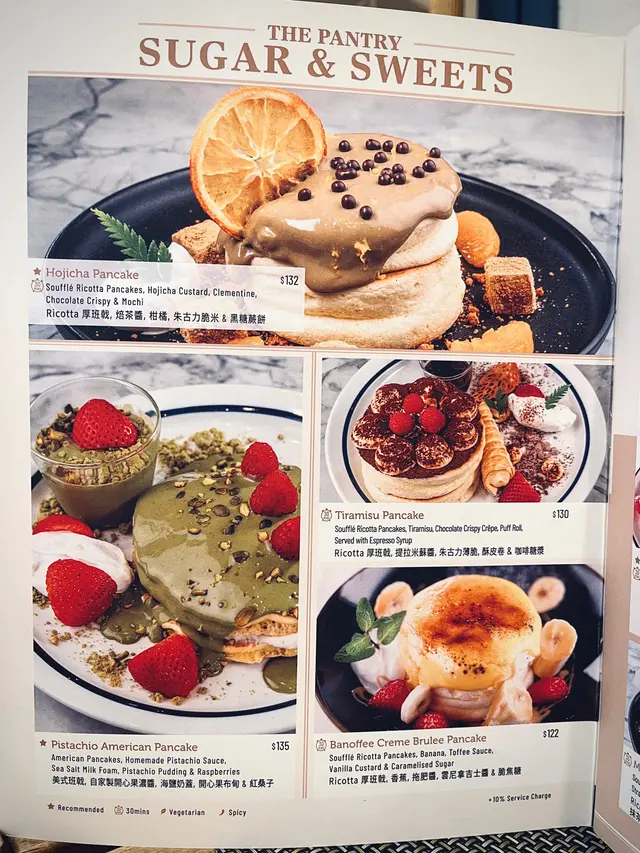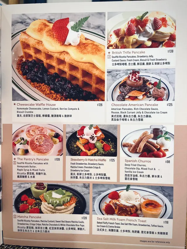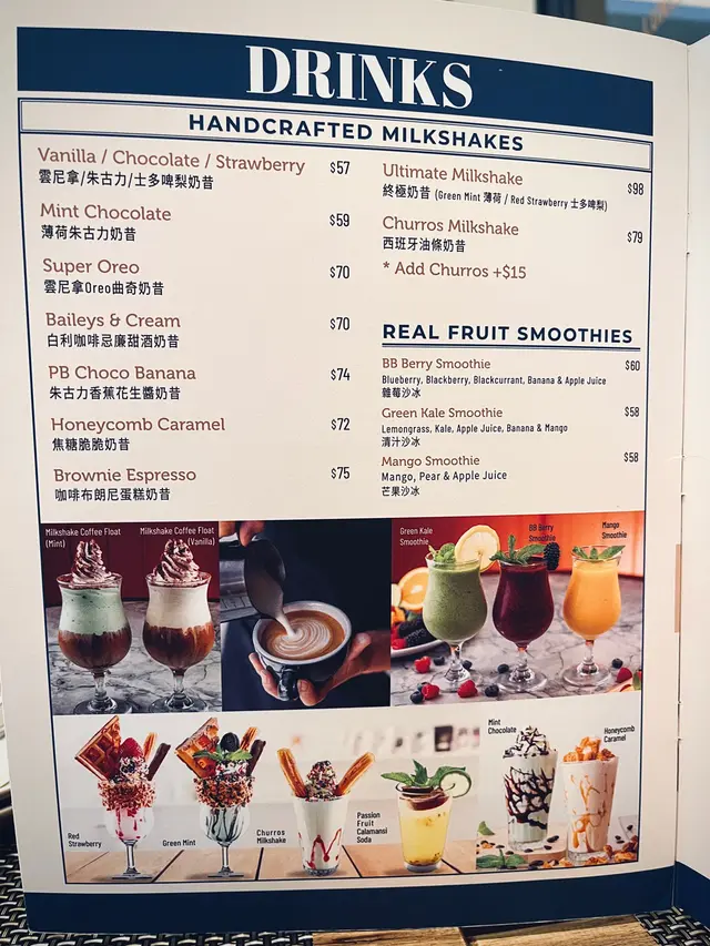 餐牌選擇繁多,包括全日早餐、牛扒、炸魚薯條、漢堡、梳乎厘班戟、法式多士、窩夫甜品等,最新menu添加了不少全新菜式。
