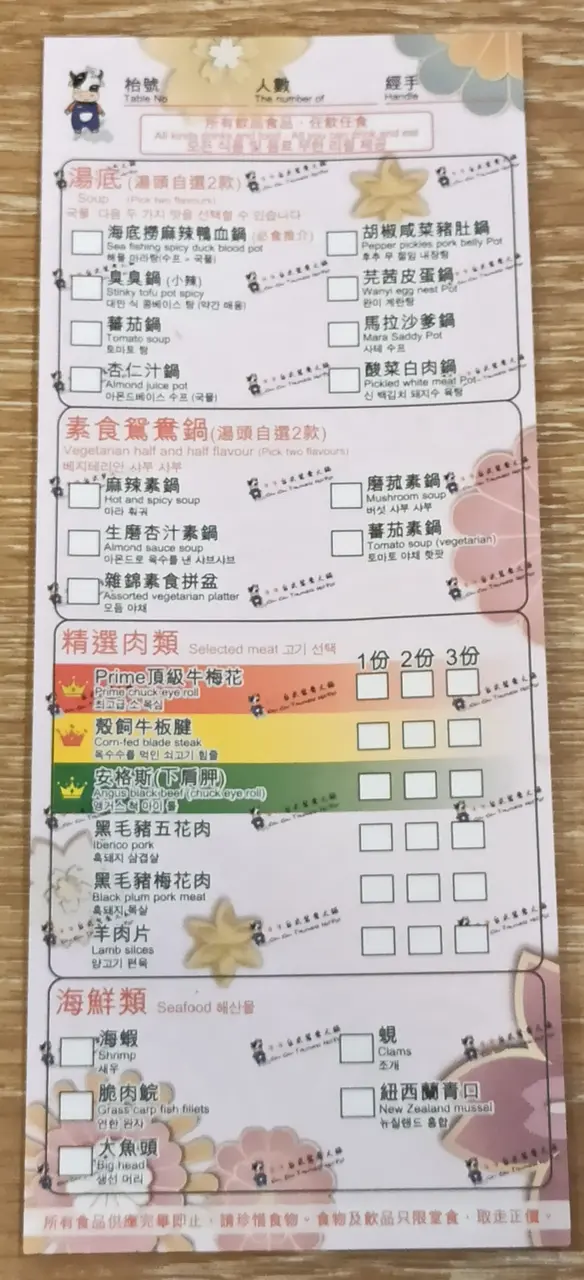 以上肉類及海鮮都係抄剔紙仔入單,其他火鍋配料係出面自助區拎。