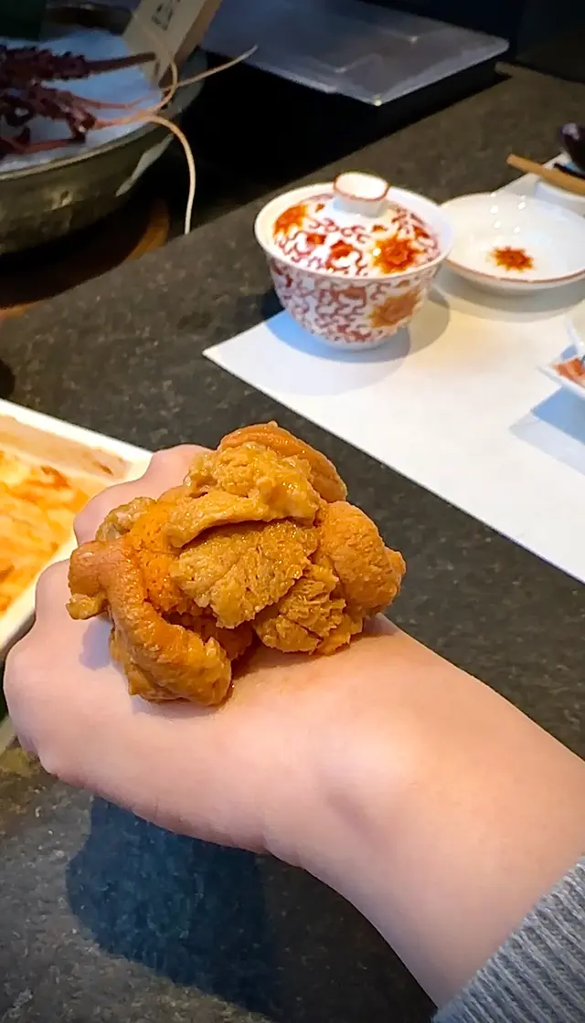 重頭戲!握起拳頭,師傅將大量赤海膽堆滿手背,想豪邁地一口吃下但失敗。看到盒子是北海道浜中小川赤海膽,質地細膩甜美,在口中徐徐融化,幸福感爆棚。
