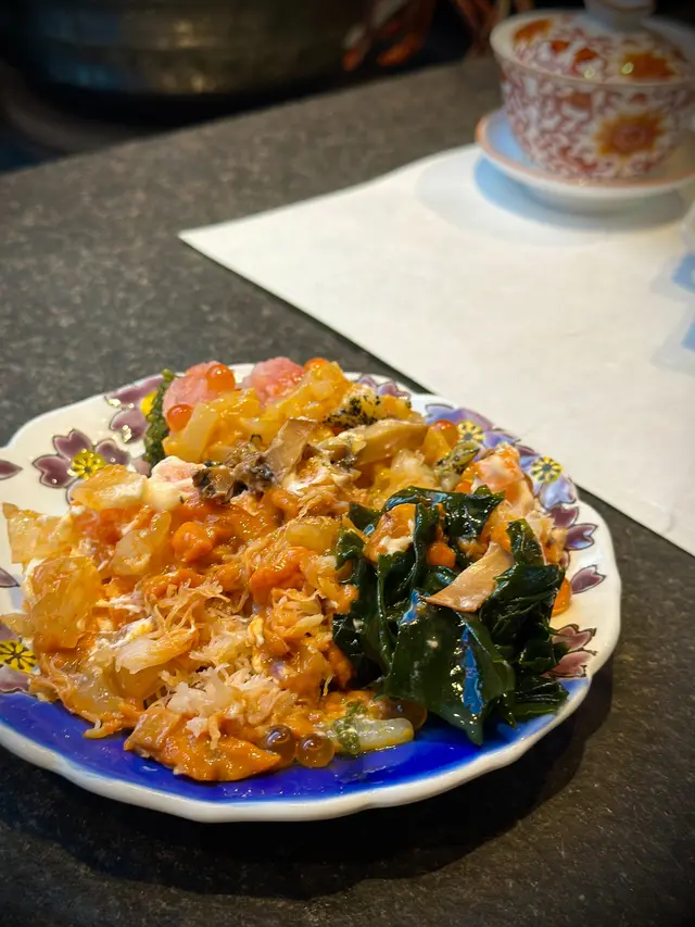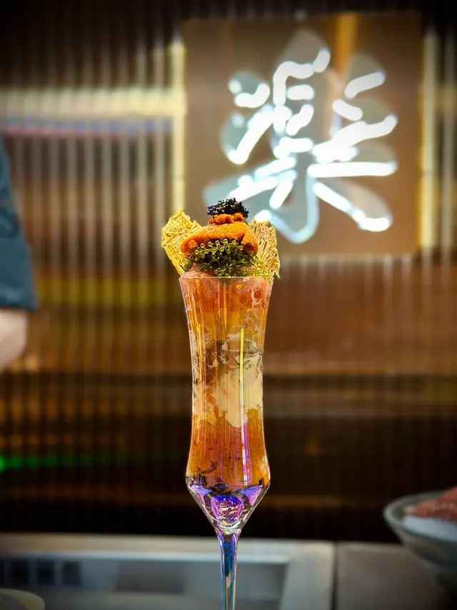 招牌菜!選用北海道紫海膽、松葉蟹肉、藍鰭拖羅蓉、三文魚子、北歐花膠等各種奢華食材層層堆疊。先用白飯魚脆片搭配海膽;再用小勺子挖出十八層配料,撈勻後啖啖爆發海膽香與魚生的鮮香,口感層次勁豐富。