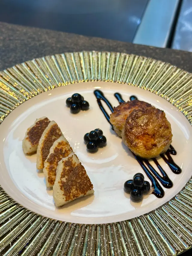 鵝肝中也釀入海膽,搭配藍莓醬珠珠與山藥煎餅,口感很有特色。