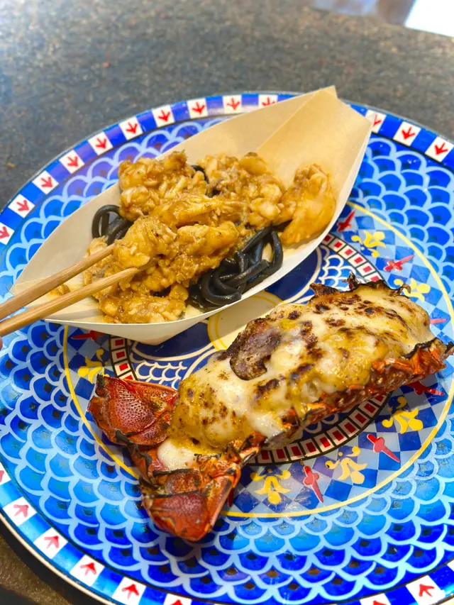 第一食海膽醬芝士焗龍蝦,雙重芝士拉絲混和海膽醬與羅勒香,惹味又不搶龍蝦鮮甜。第二食蝦膏牛油竹炭烏冬,牛油香濃,烏冬滑溜掛汁,龍蝦肉彈牙鮮嫩。