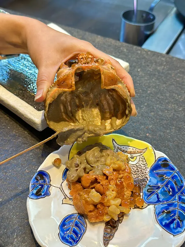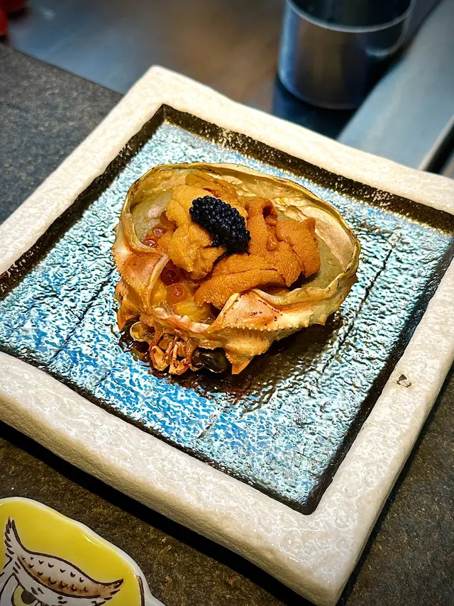 閃火紙熊熊燒起,裡面的神秘菜式是海膽甲羅燒!蟹膏、海膽、松葉蟹肉、三文魚籽與黑魚籽的奢華組合,是我吃過最浮誇又最美味的甲羅燒。更amazing的是吃到一半師傅奉上松露薯片,超夾,真心佩服師傅的創意!