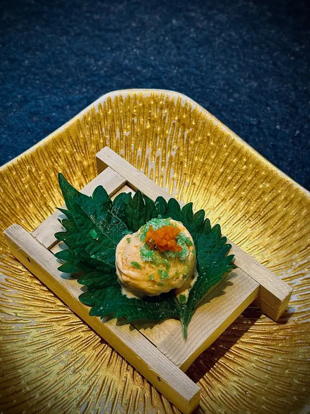 結尾也是海膽!DIY雪糕的奶香滲透海膽味,鹹甜香氣配上紫蘇葉與爆炸糖海膽粒,宛如分子料理,創意滿分。