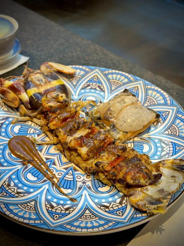 野生斑馬瀨尿蝦足30cm,一看便知貴價貨色!鐵板燒至殼脆肉嫩,蝦膏流心爆漿超鮮甜,再蘸些牡丹蝦膏醬汁,正到難以形容!!