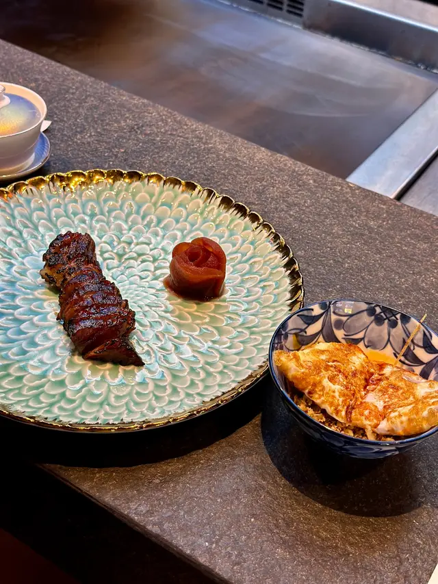 這個港日Fusion有驚艷到我!把醃製慢煮的A5和牛炙燒成叉燒,配搭爆漿的煎蘭王蛋與炒椰菜花飯,伴碟的紅酒蘋果帶著肉桂香。明明已超飽,但太美味還是吃得乾乾淨淨!