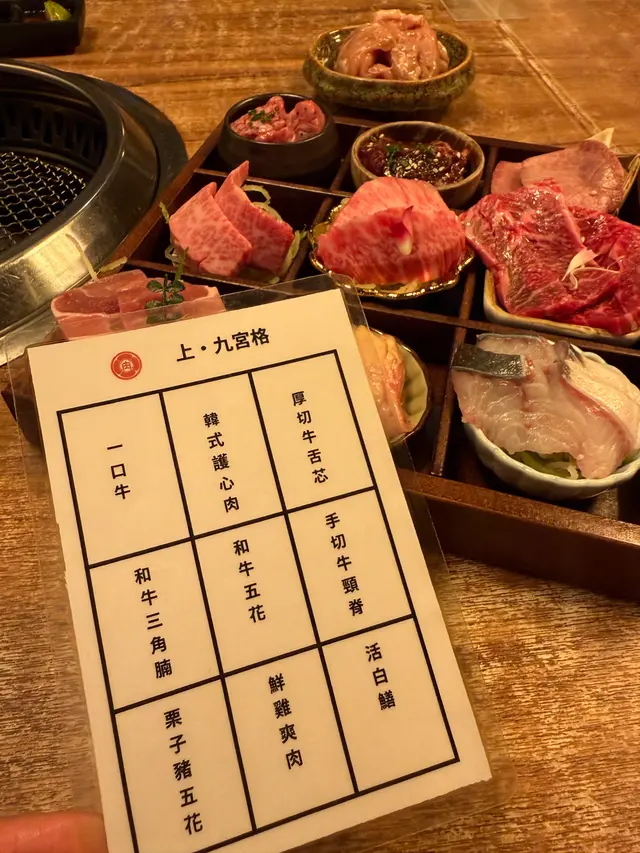🐮上九宮格$388有齊唔同和牛部位,一口牛、牛舌芯、三角腩、牛五花、牛頸脊、油花靚又入味,牛味都夠哂重,另外仲有埋雞爽肉、豬五花同白鱔,啱晒一班人分享!