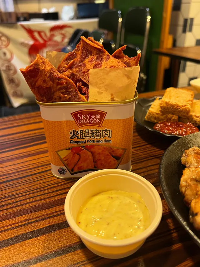 餐肉切到超薄,炸到脆卜卜好似薯片咁,仲用午餐肉罐裝住,好盞鬼!