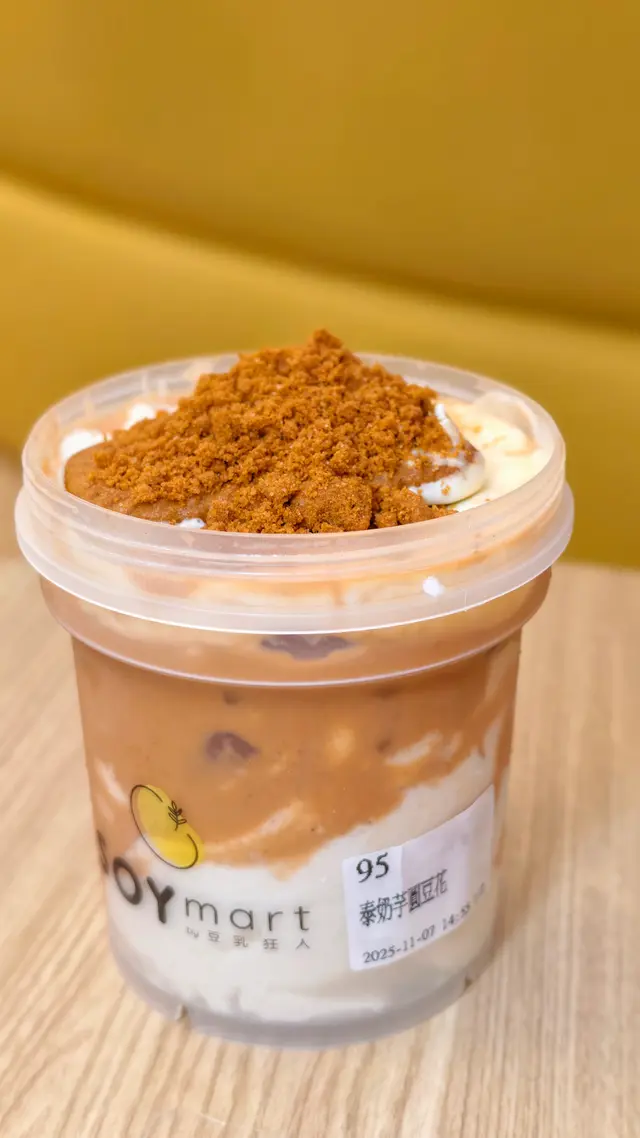 上層再鋪上焦糖Lotus脆餅🍪+鹹味芝士奶蓋🧀,甜中帶鹹,層次超豐富~香滑豆花→濃郁豆乳→微甜泰奶→香脆Lotus→軟糯芋圓,食落甜度啱啱好,唔會膩,如果泰奶濃啲就更加好💫