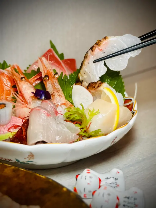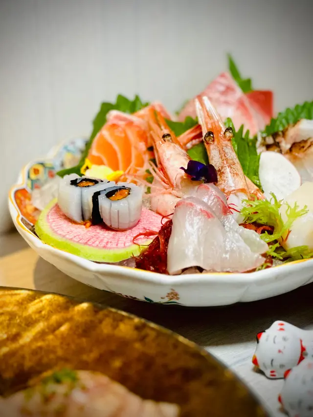 刺身盛合內容豐富,有油甘魚、三文魚腩、間八、鯛魚薄切、魷魚海膽卷、帆立貝、甜蝦,份量適合一至二人,刺身肥美新鮮,厚切口感叫人滿足。