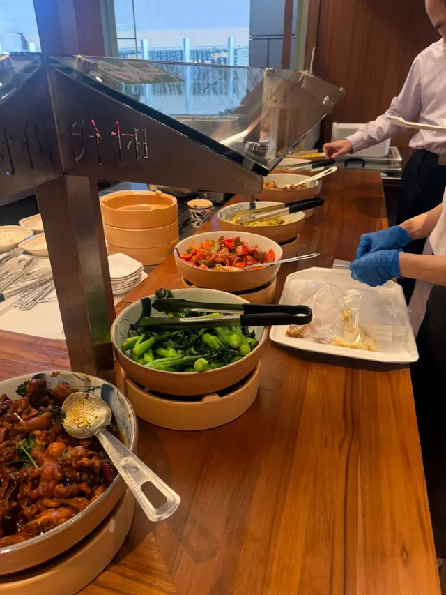 店內環境乾淨明亮,開放式取餐區有熱盤、小炒、蒸菜、涼菜、粥湯等等,選擇比想像中豐富。