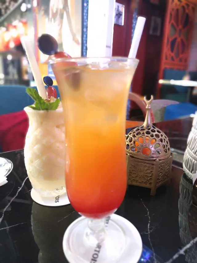 我們揀了間有幅跳舞女郎油畫裝飾既埃及餐廳坐低。由於時間尚早,先嚟Happy Hour叫了杯 Pineapple Smottie同埋Passionfruit Fruitpunch,兩杯都充滿清新果香🍍🥭🍓🍉