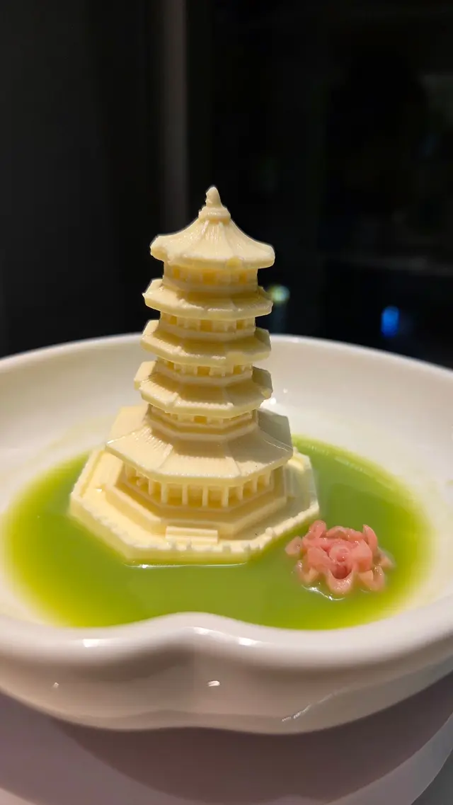 造型細緻打卡一流,奶白色迷你奶凍,浮在碧綠色嘅西湖面上,甜品來說不算太甜,只是精緻到捨不得食😝