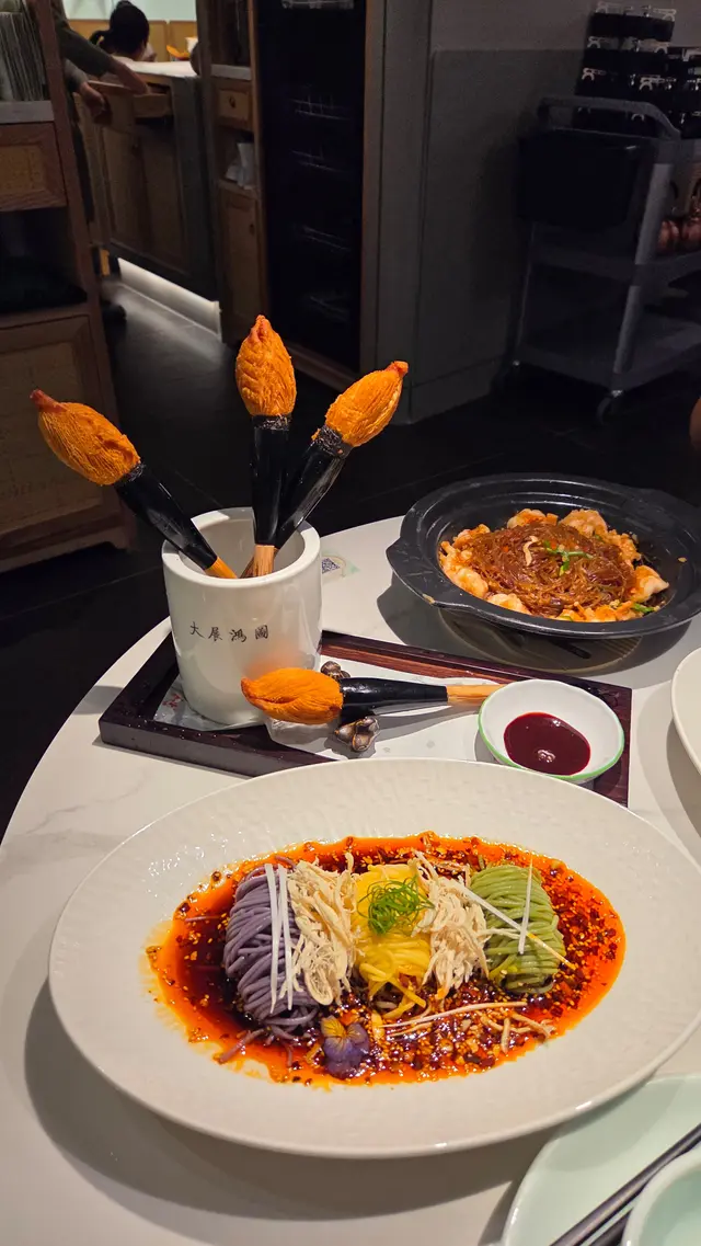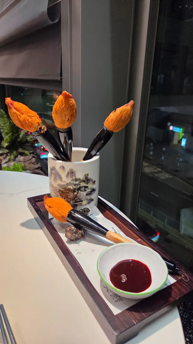 做到一枝枝毛筆嘅造型好得意🤩 外層係酥脆,裏面是白豆沙茸不甜的,點朱古力醬扮點墨,玩味十足🤪