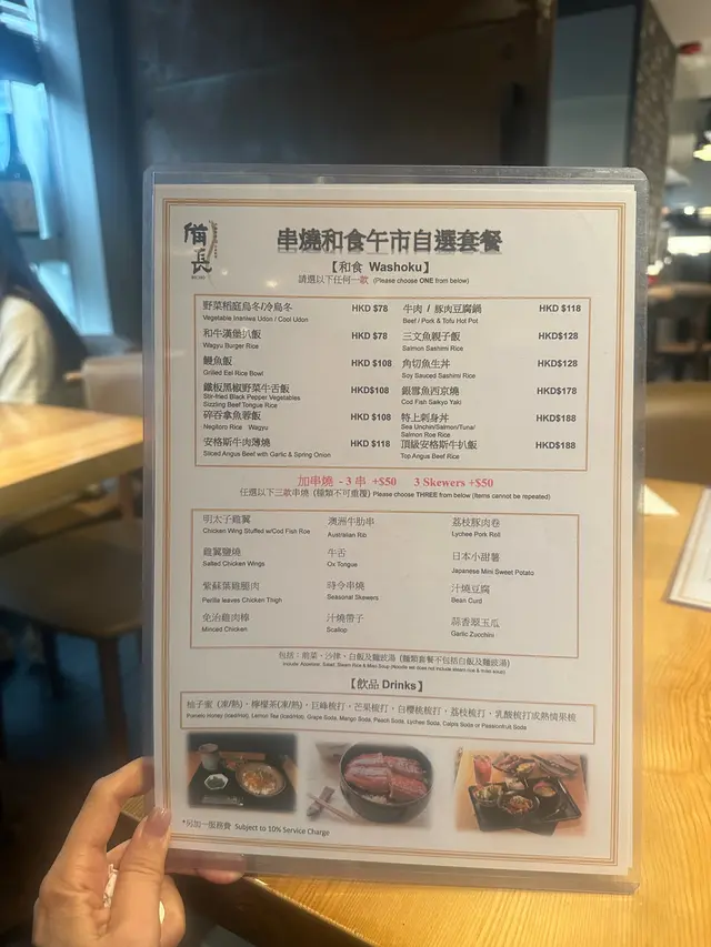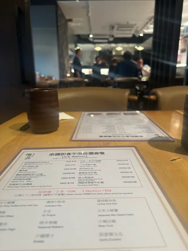 呢間餐廳真係開咗好多年,經過疫情都屹立不倒,都戥佢開心,好耐冇嚟今日再食返,感覺普通咗,唔似以前每一次嚟都好有滿足感,不過都唔係差嘅。lunch set 我哋叫咗「鐵板黑椒野菜牛舌飯」同埋「銀雪魚西京燒」。另外每人加$50要咗三串串燒(記得以前唔使加錢),串燒叫咗牛舌、豆腐、鹽燒雞翼、日本小甜薯、澳洲牛肋串,同埋汁燒帶子。鹽燒雞翼仲係以前咁好味👍🏻,但係牛舌就普通咗好多,其他串燒就正常發揮。佢哋仲會包一杯嘢飲,我哋兩個都叫咗「巨峰梳打」。