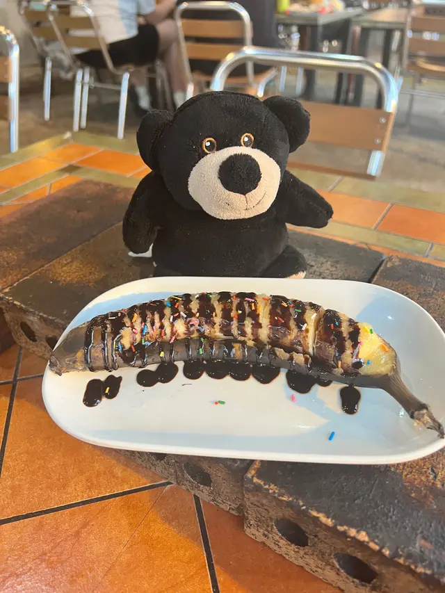 燒香蕉🍌—燒到香蕉兩面黑色,就可以放在碟上拎到飲品士多處給職員幫忙加朱古力醬及裝飾
