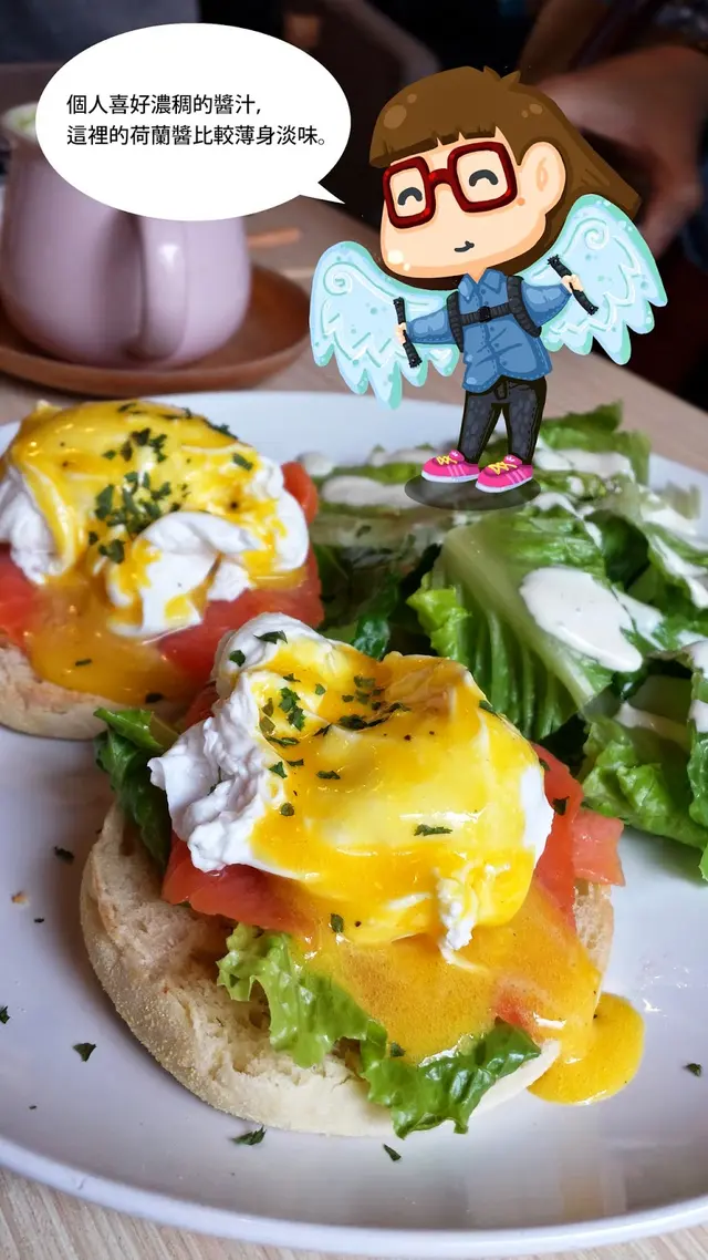 Rose Latte的味道看來就不是大牧羊仔仔杯茶了,三杯飲品中Green Tea Latte是最好喝的!隋之而來是我們的熱食啊!Wing一直期待的班尼迪克蛋(Egg Benedict)啊!可能我們喜歡濃稠口感,感覺荷蘭醬汁(Hollandaise Sauce)就是差一點點,醬汁比較薄身淡味,汁放不夠。水煮蛋是恰到好處的流心狀態。普普通通的Egg Benedict囉!畢竟這裡是香港,不是在西方國家,始終不能跟我們在紐西蘭吃到的味道相比。還要這裡是荃灣,聽說荃灣區只有他們的店供應班尼迪克蛋(Egg Benedict)。