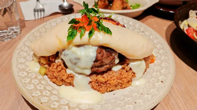滑捋捋的半熟蛋奄列,超大份量的漢堡扒肉,熱呼呼的炒飯, 配搭香味濃厚的芝士汁 , 多重口感又美味。