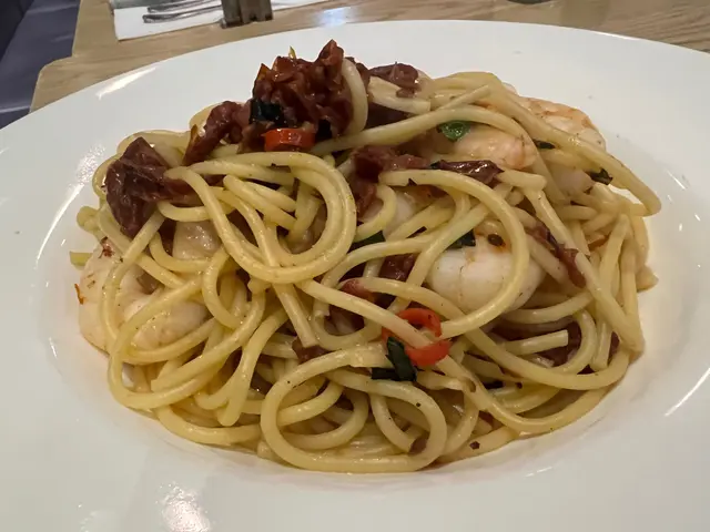 香辣蕃茄乾海鮮意粉。本身意粉炒得非常乾身。再配合乾咗蕃茄有獨特的味道配合。擺脫一貫傳統港式用蒜茸炒意粉的沉悶。