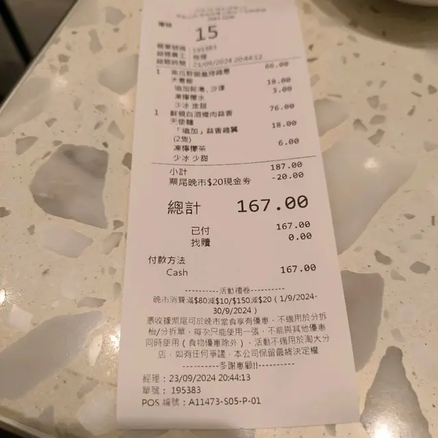 由於朋友上次嚟過食嘢,有keep到優惠嘅飛尾,今次竟然可以當廿蚊使用,真心抵呀!80蚊減10蚊,150蚊減20蚊,正常一個晚餐都會用得著!門檻極低👍🏻