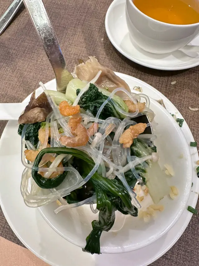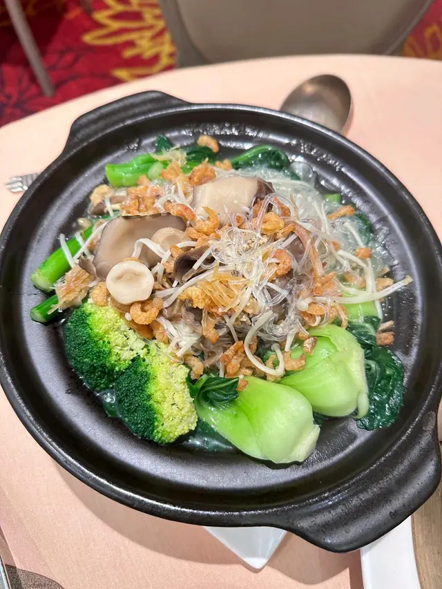 海味粉絲雜菜煲:雜菜種類好多,有菜心、生菜、西蘭花、小棠菜、白菜仔同椰菜,都係第一次見,幾有心機。海味有冬菇同蝦米,用左高湯去煮,無油清淡但好夠味。整體份量非常多,係每一款配料都多,成個煲滿晒,一D都唔姑寒。