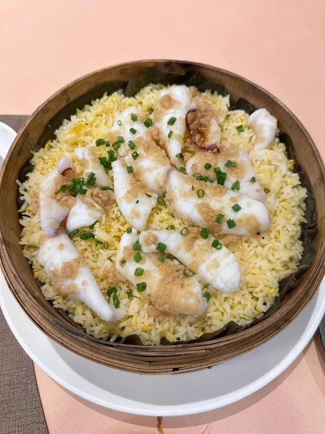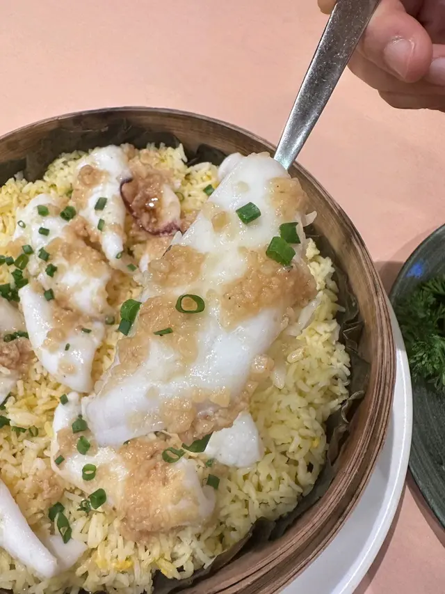 金銀蒜鮮魷籠仔蒸飯:熱辣辣,食得出魷魚鮮味,爽口,好香蒜味,飯加左雞蛋去蒸,蛋味香,不用加任何調味料已經好好食。