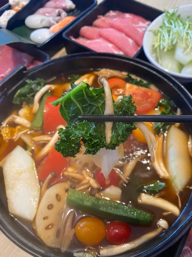推薦蕃茄、冬瓜、秋葵、蟹味菇、羽衣甘藍、生菜等等,全部都係好夾蕃茄壽喜燒湯底嘅菜款,尤其係索汁之餘又可以令湯底更清新嘅冬瓜。