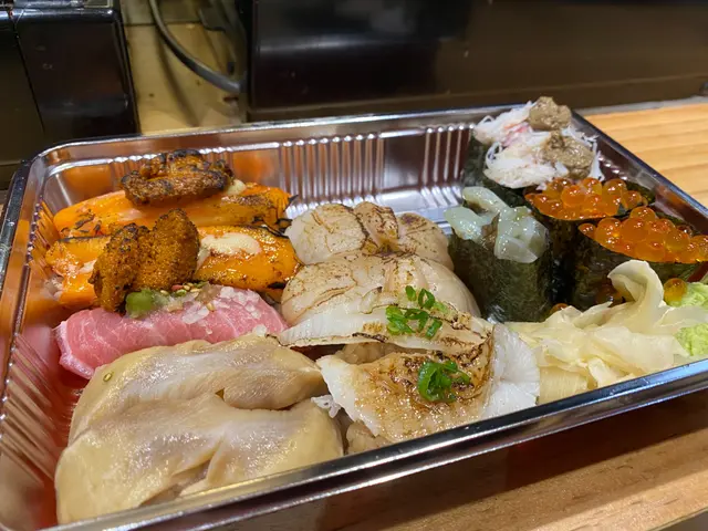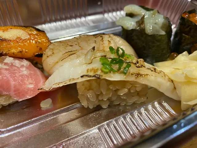 之後到今日嘅重點壽司啦!我同朋友叫咗火炙北海道帶子壽司、火炙左口魚邊壽司、火炙海膽蟹棒壽司、大吞拿魚腩壽司、北海道活象拔蚌壽司、芥辣八爪魚壽司、三文魚子軍艦同蟹肉蟹膏軍艦