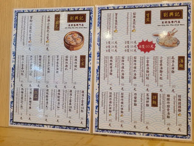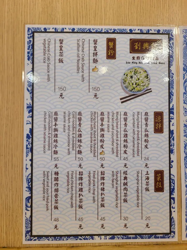 餐牌:生煎包類、新品推介、皇牌套餐、菜飯類、湯麵類、拌麵類、蟹粉類、小食類、涼拌類、小籠包類、飲品。落單掃QR code。