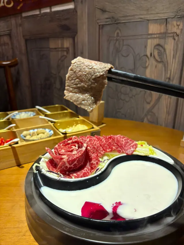 呢個真係全場焦點~手切牛肉浸一浸北海道牛奶再落鍋,口感軟嫩得嚟又有微微奶香,啖啖都好順滑。牛肉浸完奶落鍋,好似貴妃出浴咁,視覺效果好正