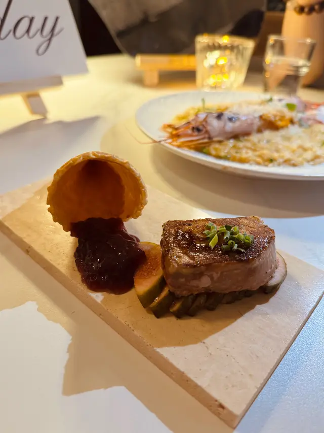 好邪惡!!😈超厚身鵝肝,爆香油脂,用脆筒裝住加埋雜莓啫喱&無花果一齊食,完全唔覺得油膩~