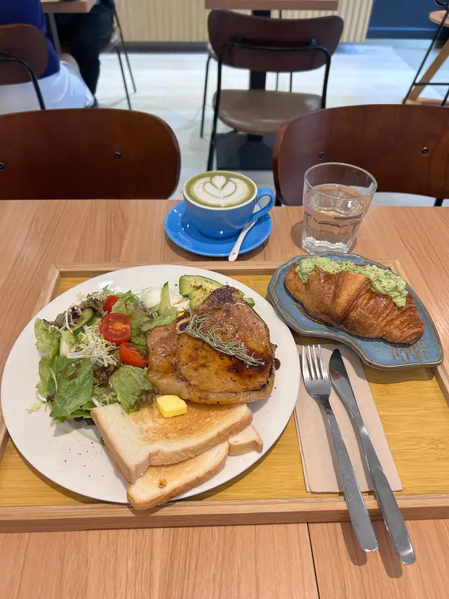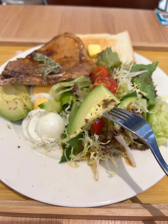 沙律菜好新鮮,伴黑醋汁;烚蛋又健康,又有蛋白質;牛油果充滿膳食纖維;仲有兩塊牛油多士烘得好脆;豬扒慢煮好入味,而且加了少少黑椒去調味不錯!