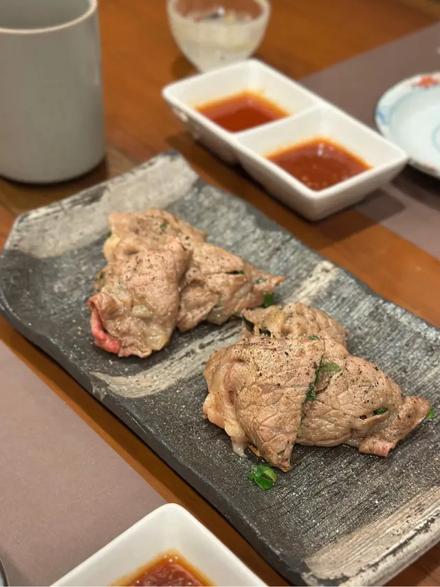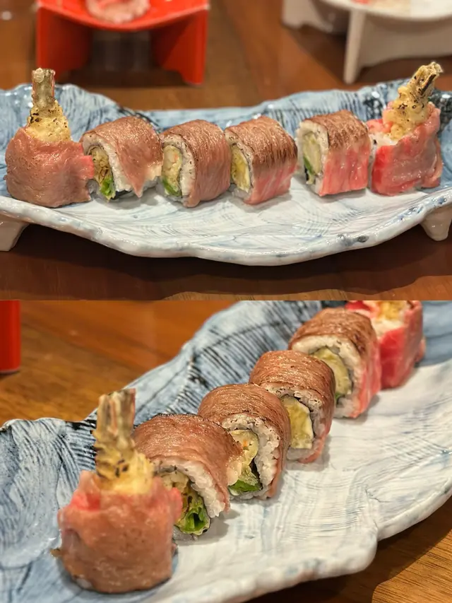 中間是香脆的天婦羅炸蝦,外層裹上油脂分布平均的和牛,可以直接吃,或者要求餐廳炙燒一下,每一口都好幸福🤤🤤🤤