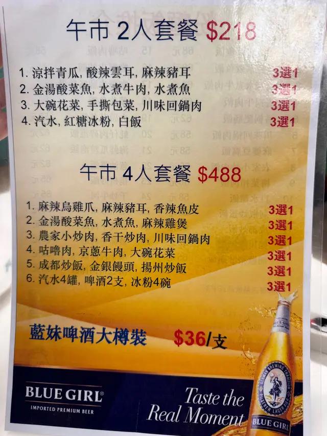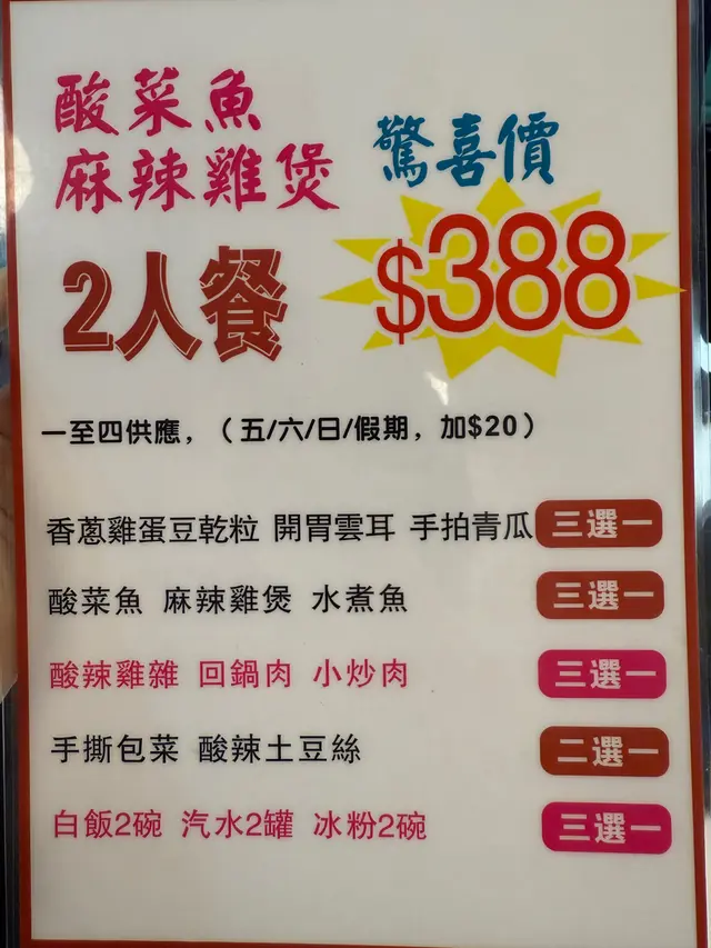 包括一個前菜(涼拌青瓜/酸辣雲耳/麻辣豬耳)、主菜(金湯酸菜魚/水煮牛肉/水煮魚)、蔬菜(大碗花菜/手撕包菜/川味回鍋肉)、 汽水、紅糖冰粉、白飯!