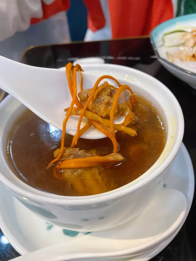 材料有雞肉, 紅棗, 龍眼肉和蟲草花, 雞湯味道鮮甜, 夠滋潤, 啱哂而家啲天氣飲呀!