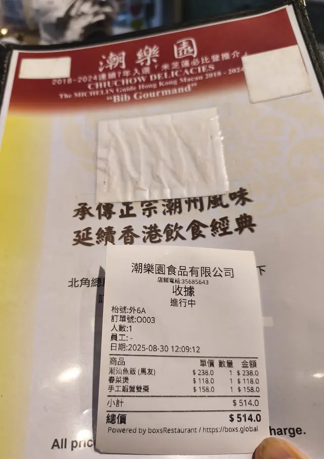 北角食潮州菜 Fungkh0926等级42025-08-301K 浏览 关注 表姐喺英國返港,我帶佢去食潮州菜,老友推介位於北角1和富道96號僑裕大廈地下4號的【潮樂園】,因為有潮州老師傅主理,主打潮州手工菜,而且餐廳已在北角開業超過11年,由2018年起至2025年,連續8年獲得米芝蓮必比登推介。🥢潮州家常菜之潮汕魚飯 $238:魚飯原來可以揀烏頭或者馬友,我哋揀咗馬友,魚肉嫩滑鮮甜好味,有油脂係上品貨,配普寧豆醬,凸顯鮮甜美味。🥢手工蝦蟹棗 $158:潮州名菜之一,蝦蟹棗都炸得香脆可口,蝦棗鮮甜彈牙,蟹棗皮脆肉嫩,蘸潮色甜酸醬,十分美味。🥢潮式春菜煲 $118:春菜青綠鮮甜,配香口的五花腩片、蒜粒、蝦米...等配料,口感豐富和好味。以上食记乃用户个人意见 , 并不代表OpenRice之观点。赞好分享北角食潮州菜 潮樂園 (和富道) https://s.openrice.com/QrLT0jorU00检举 张贴 评分5味道4环境4服务4卫生5抵食用餐途径堂食