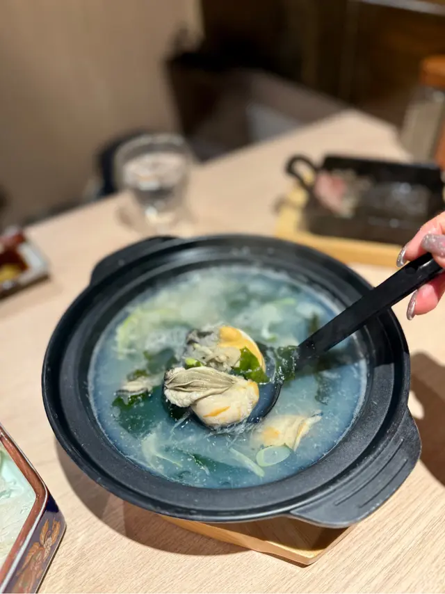 蘿蔔蓉 & 昆布煮湯頭,拌勻後喝味道鮮甜。再用秘製醬汁蘸點(酸汁 & 辣蘿蔔蓉)同吃,去油膩又倍感滋味。