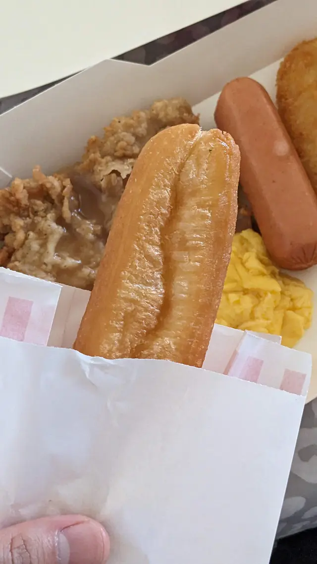 最令人失望的是那條「油炸鬼」(油條)。它外型細長,像一條加長版的甜甜圈,跟傳統中式早餐那種粗壯、蓬鬆、充滿氣孔