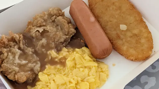 今早特意試了KFC的早餐,整體體驗只能說是中規中矩。我點了一份包含炸雞扒、腸仔、炒蛋、薯餅和通粉的套餐(從圖片看,似乎是某種特惠或精選早餐)。