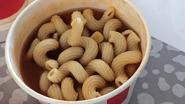 先說主菜部分。炸雞扒份量足夠,配上蘑菇肉汁(Gravy)是港式快餐的常見做法,味道還算搭調。炒蛋色澤金黃,但口感略嫌不夠滑嫩。腸仔和薯餅是標準的快餐配置,沒甚麼驚喜,也沒甚麼大錯。通粉方面,那個彎彎的螺絲粉(Cavatappi)放在清湯或雞湯中,有種獨特的港式風味,不過湯底味道比較淡,麵體煮得還算軟硬適中。