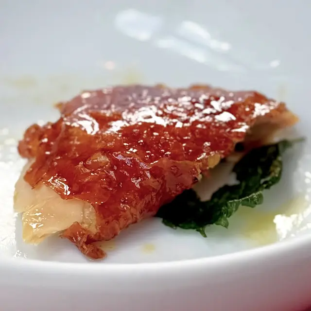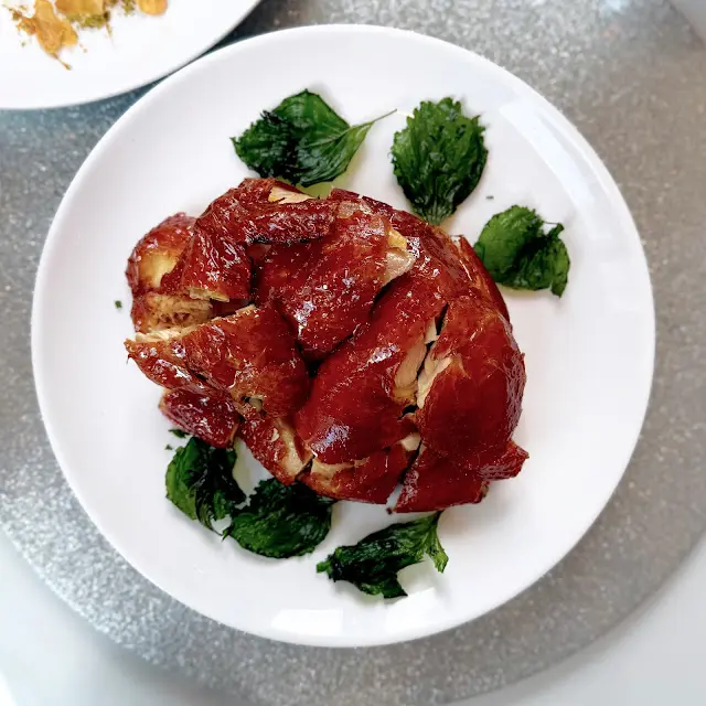 脆皮茶香雞$328/半隻!新鮮龍崗雞以茶葉及白米燻製後再炸至香脆,幽幽的煙燻香氣引人入勝皮脆肉嫩百吃不厭。