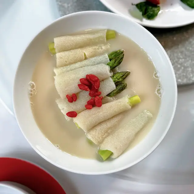 魚湯浸竹笙蘆筍$268!竹笙厚身爽口索滿了魚湯的鮮香更加迷人,配襯的翠綠嫩口的蘆筍清甜不已,最後別忘嚐一口奶白濃郁的鮮味魚湯喔。