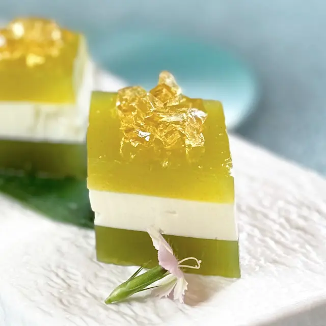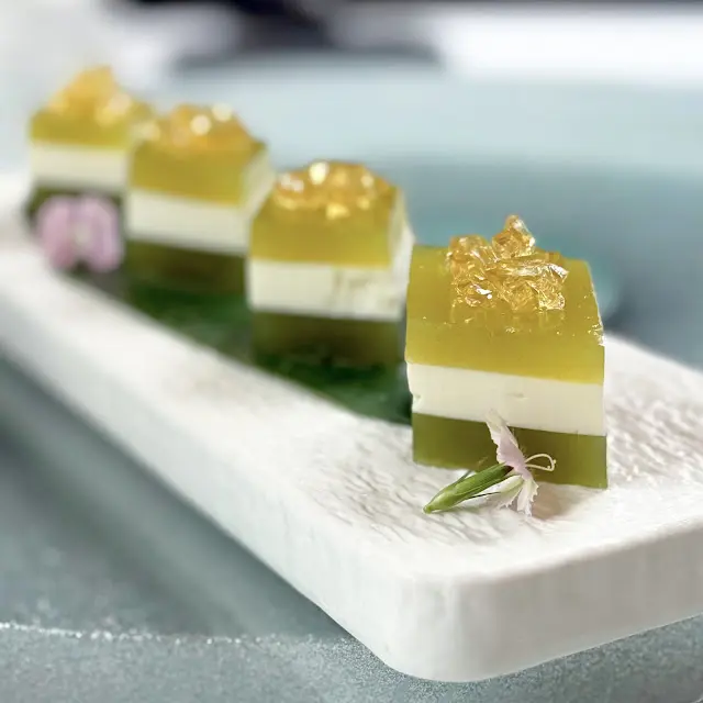 這天的甜品也逃不過涼瓜!大廚為我們帶來蜂蜜涼瓜凍糕$68,用上本地冬蜜及杜阮涼瓜汁炮製而成,翠綠色的是涼瓜凍糕內藏滿涼瓜肉碎中層是爽滑香甜的奶凍,涼瓜凍糕口感非凡清甘香甜很有特色。