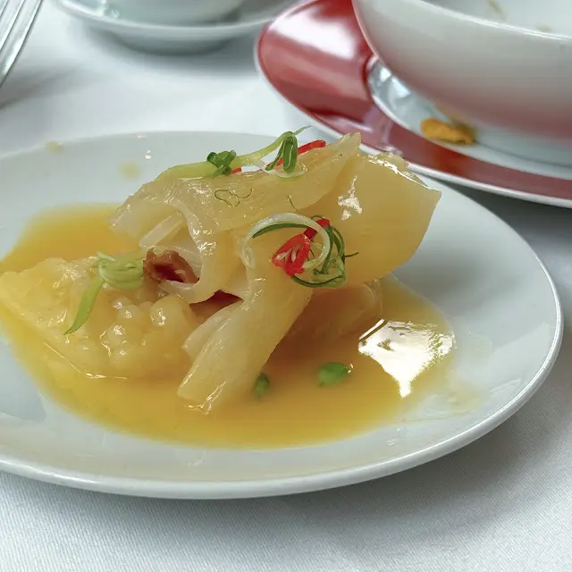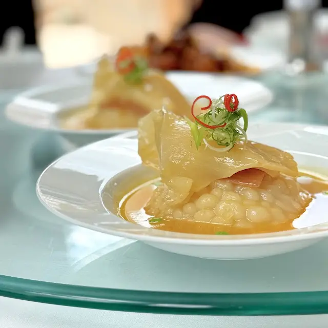 白玉涼瓜雲腿扣花膠$298!皮厚多汁的中國白玉涼瓜及花膠以濃湯煨至入味,花膠的軟滑加涼瓜的腍拼出完美口感,配搭鹹鮮的雲腿及清甜南瓜芡一起品嚐好享用。