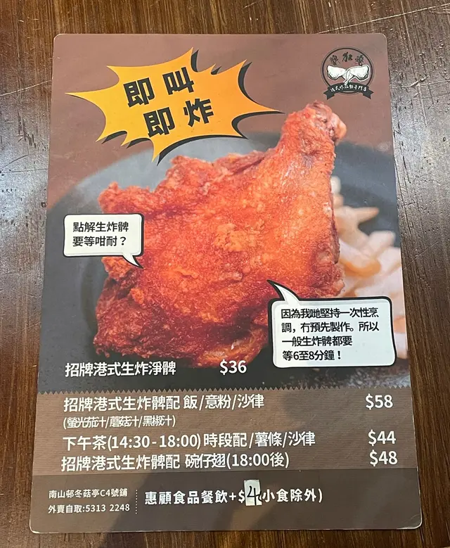主打的招牌港式生炸髀,堅持即叫即炸,外皮金黃酥脆,內裏的雞肉鮮嫩多汁,口感豐富且份量十足,完美還原了兒時的味道。配上一碗港式碗仔翅,滿滿的雞絲、冬菇絲和木耳絲,每一口都濃郁鮮美,加入麻油和紅醋後更添風味,令人回味無窮。