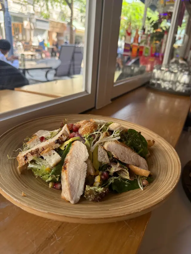 雞肉沙律,首先份量十分足夠,意像不到的滿滿一大盆,各款新鮮沙律雞胸肉份量也不少,略略煎過外層金黃,味道層次更豐富。