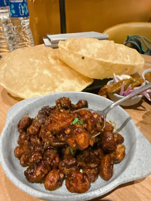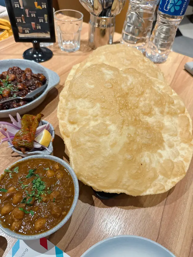 叫咗餐廳招牌菜式,望落去好似巨大版煎堆,其實又蓬鬆又大的油炸麵包Bhatura,食落煙煙靭靭,本身食會冇味,點了惹味及香濃微辣咖喱醬汁,入邊重有鷹嘴豆,加埋辣椒、生洋蔥、檸檬汁一齊食更添口感。