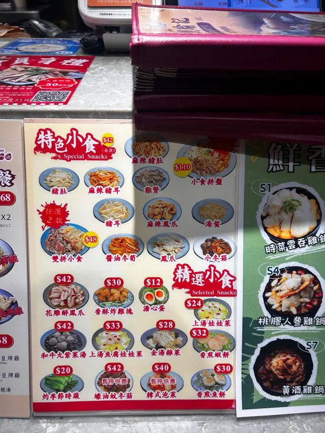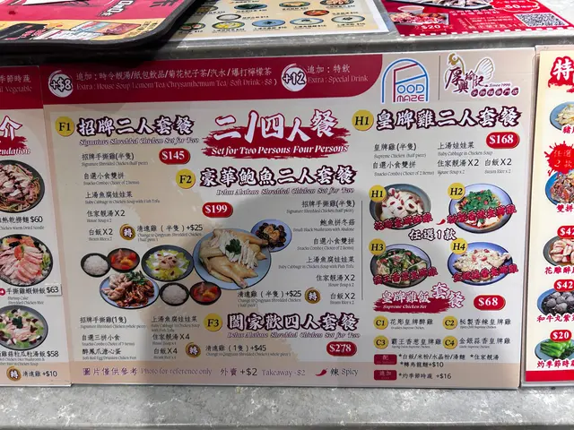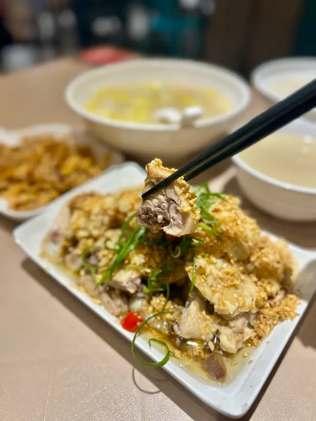 二人套餐包括咗有皇牌雞(半隻)、自選小食雙拼、上湯娃娃菜、住家靚湯兩碗同白飯兩碗😆性價比嚟講都相當高!首先皇牌雞方面有花雕、香辣、蔥香同金銀蒜香四款口味選擇,而我哋就揀選咗金銀蒜香味🧄滿滿蒜蓉加上炸蒜,蒜香味十足!而且雞肉入味,重點係肉質都幾嫩滑😙自選小食雙拼方面我哋就試咗麻辣豬耳同豬肚,個人感覺有啲偏辣🙈不過都幾惹味㗎!上湯娃娃菜👍🏼因為真係份量係超多,仲要有埋魚腐😍娃娃菜同魚腐都索晒湯汁,夠晒鮮甜😋至於湯方面,當日係青紅蘿蔔湯🥕味道就正常發揮啦🤣不過飲完冇口乾,都滿意🤓最後白飯方面係可以免費轉配米粉、水晶粉同湯麵~用少少炸蒜同埋雞肉嘅醬汁撈落個麵到,味道即刻昇華咗🤭整體嚟講,兩個人係夠晒飽肚同滿足!